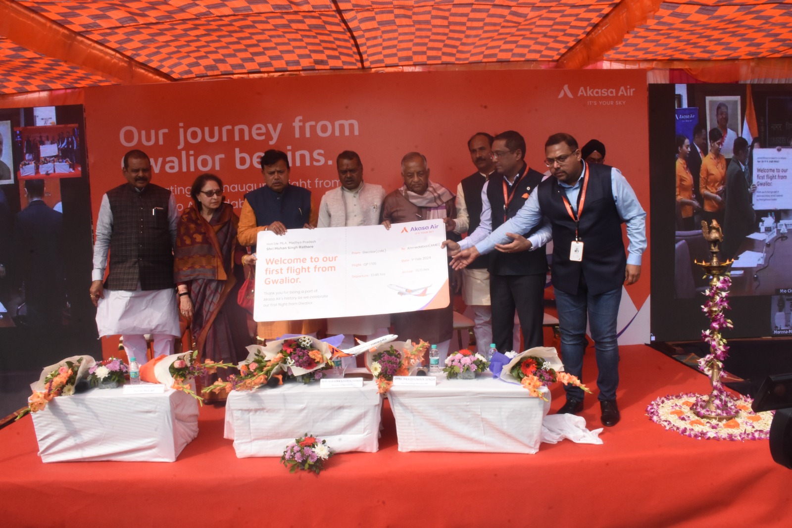 At Vijayaraje Scindhiya Airport Gwalior, the inaugural flight ceremony was graced by Honourable Energy Minister Shri. Pradyuman Singh Tomar, Member of Parliament Shri Narayan Singh Kushwah and Honourable MLA Shri Mohan Singh Rathore who lit the ceremonial lamp along with Praveen Iyer, Co-Founder and Chief Commercial Officer, Akasa Air and Belson Coutinho, Co-Founder and Chief Marketing & Experience officer, Akasa Air.