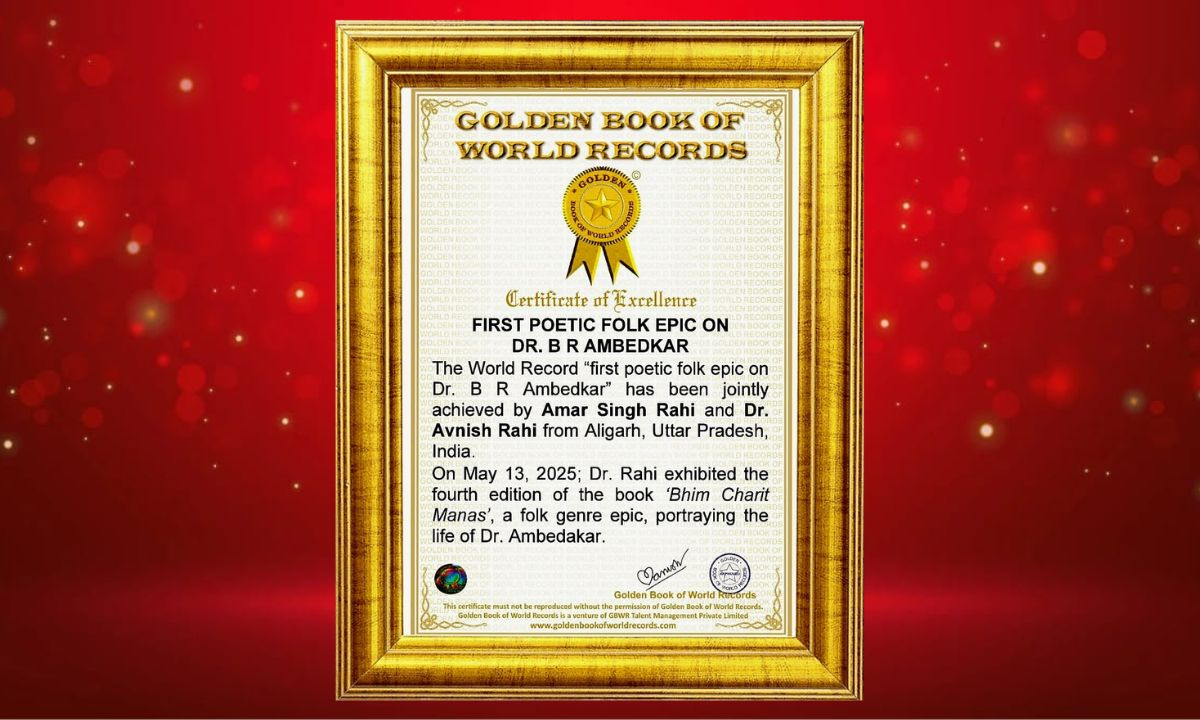 Aligarh, India: Aligarh has once again brought pride to the nation with a remarkable literary achievement. The father-son duo—renowned senior poet Amar Singh Rahi and Bharat Vibhushan lyricist Dr. Avnish Rahi—have authored the grand epic “Bheem Charit Manas”, which has been officially recognized by the Golden Book of World Records.