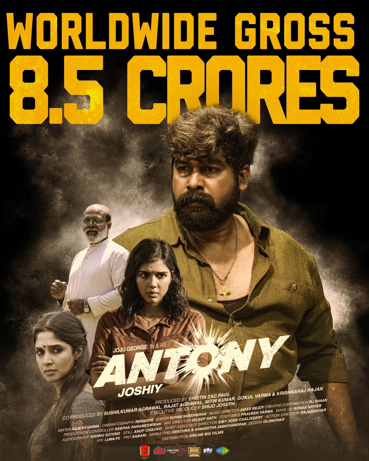December 8, 2023: Joju George and Joshiy, in their second collaboration ‘Antony,’ have once again achieved success, striking gold with the film. Captivating family audiences, it has amassed a worldwide gross of 8.5 crores. Running successfully, Antony continues to dominate the booking charts, maintaining the first-place position even on working days, marking a remarkable turnout. The film is produced by Einstin Zac Paul and the script is by Rajesh Varma.