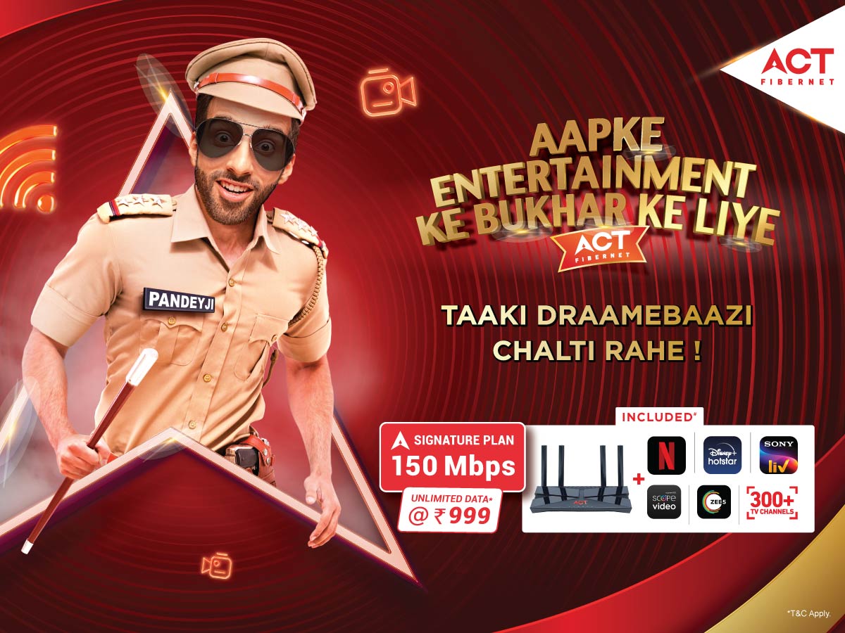 ACT SmartFiber® technology, powering ACT Fibernet connections is a high-speed Internet connection with dedicated virtual speed lanes. Which means that you don’t share your bandwidth with other users and get speeds that you’ve paid for. An average user requires internet speeds of 100 Mbps to surf, stream and work interrupted over multiple devices, hence, plans of 100 Mbps to 300 Mbps are ideal for users with high internet usage to effectively manage their internet usage. With an emphasis on offering quick connectivity, packaged entertainment, and limitless data at a reasonable price, ACT Fibernet features well-known OTT apps and live TV channels without additional fees.