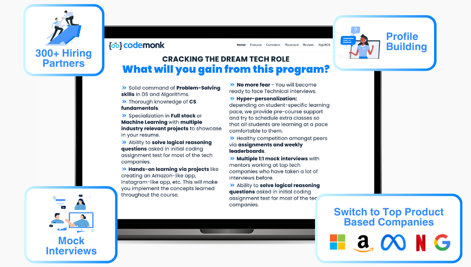 Courses at CodeMonk include command over problem-solving in Data Structures and Algorithms, system design including both high-level and low-level design, and practical exposure through industry-relevant projects. This comprehensive approach ensures that learners are well-equipped for the competitive job market. In addition to covering DSA, courses at CodeMonk Academy are designed to equip students with essential skills for succeeding in top product-based companies. According to a mentor at CodeMonk, they emphasize a holistic approach. “We recognize that cracking the coding interview isn’t just about DSA,” they explain. “That’s why our curriculum includes projects in Full Stack so the student has a portfolio of projects in their resume and Machine Learning so that the interviewer understands that student is open to learning new technologies. We teach CS fundamentals to handle basic questions and focus on mental ability and reasoning for roles in fintech and quant firms. Our experience in the tech industry ensures our students are prepared for what companies expect from their engineers.”