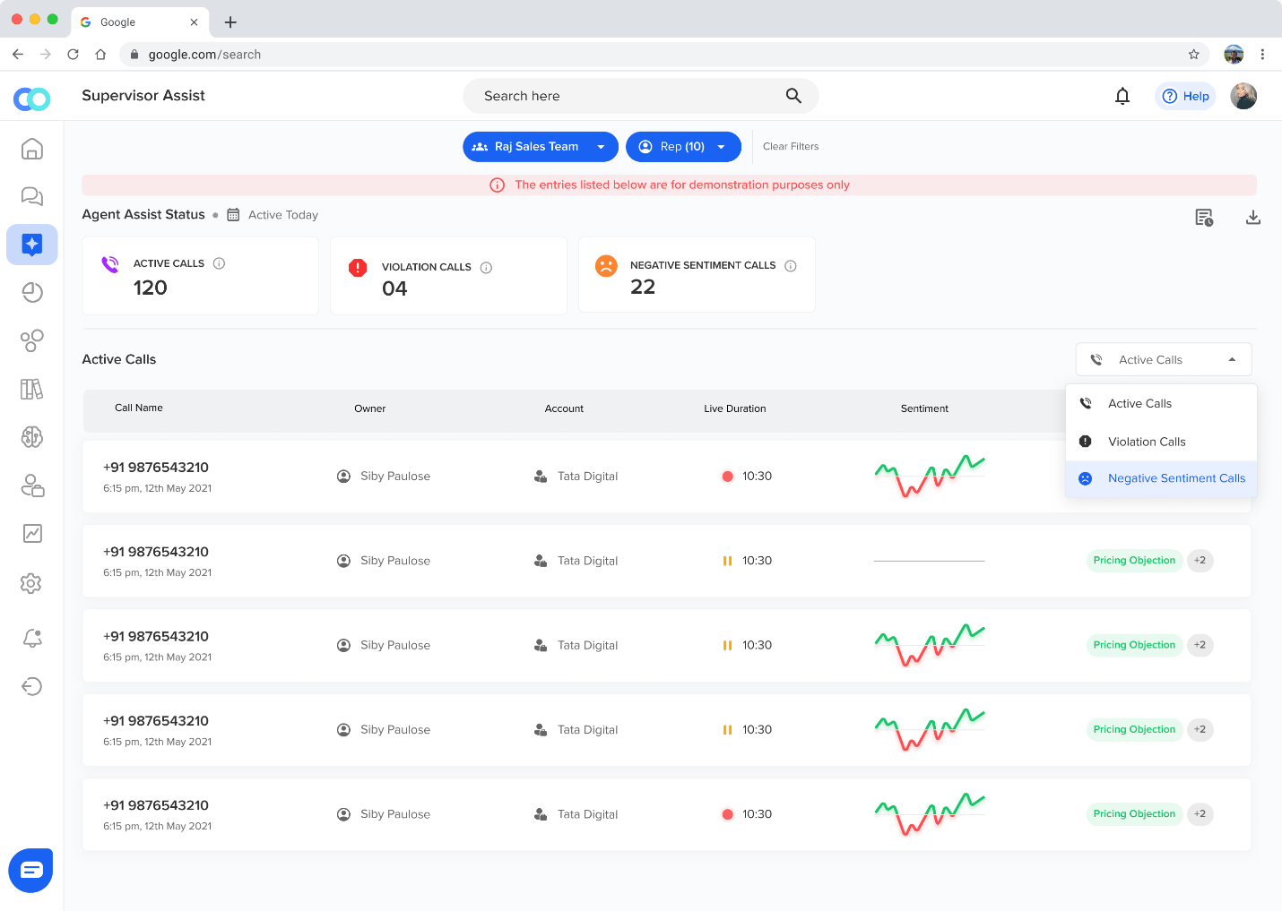 Convin’s Real-time Manager Assist offers managers a user-friendly dashboard to monitor agent performance and active calls in real-time. Managers gain insights into ongoing conversations, including live call monitoring and sentiment tracking, to assess customer satisfaction. It also alerts managers when quality standards are violated, allowing them to act promptly.