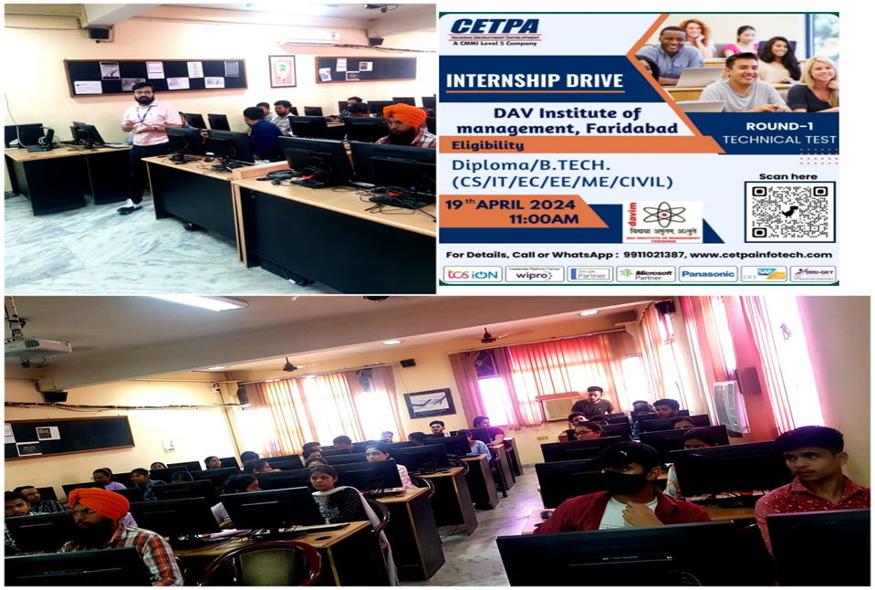 MCA Department of DAV Institute of Management, Faridabad collaborated with CETPA Infotech Pvt. Ltd and organized Internship Drive on 19th Apr 2024 for the students of B.C.A students of semester 6th and students of MCA 2nd & 4th Semester. Mr. Nitin Babbar, Manager – Corporate Relations, CETPA Infotech Pvt. Ltd was the eminent speaker of the day who made students aware of different technologies that are on high demand in the market.