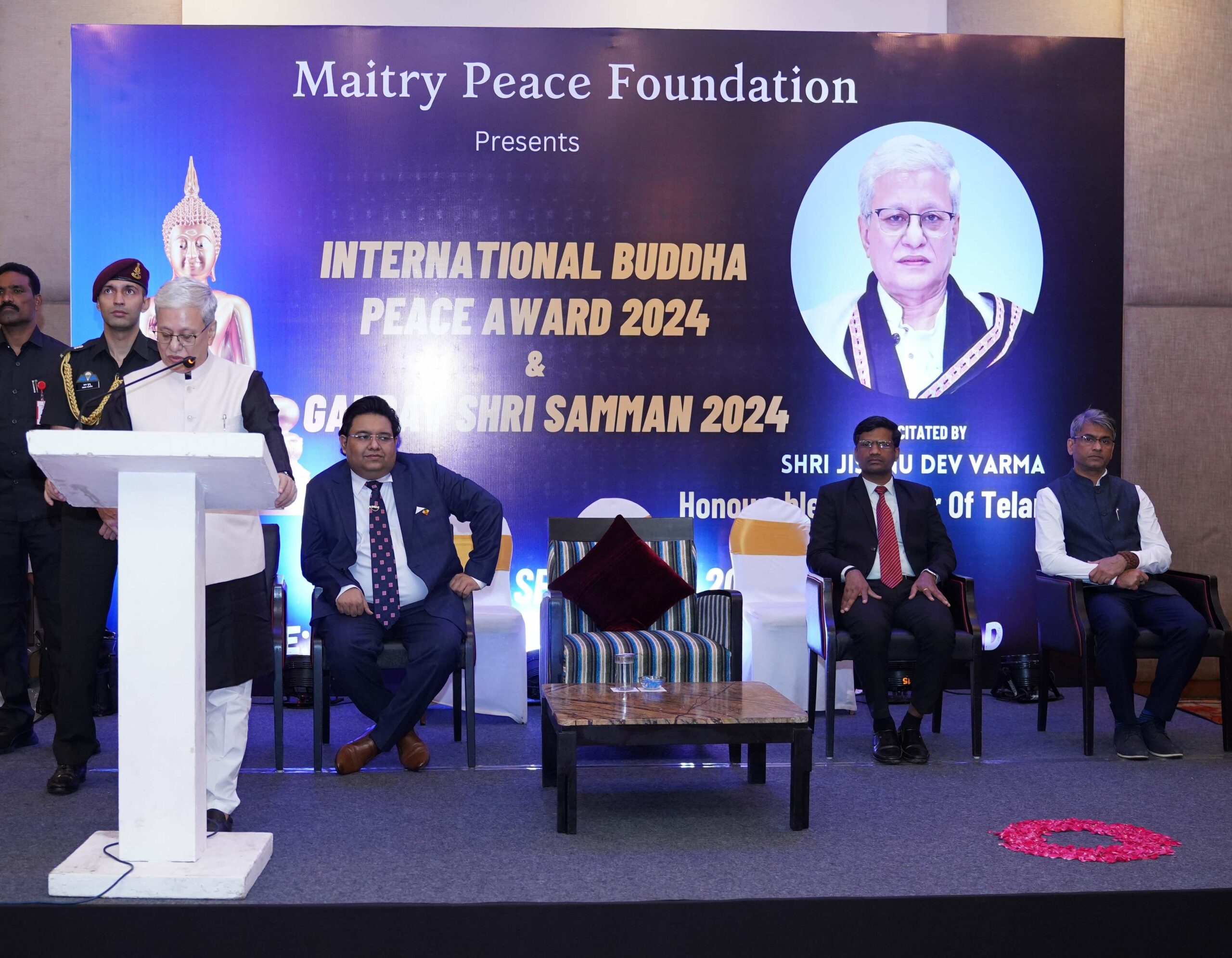 Hyderabad, 15th September 2024: The International Buddha Peace Award and Gaurav Shri Samman were presented by the Hon’ble Governor of Telangana, Shri Jishnu Dev Varma, at a grand ceremony held in Hyderabad on Sunday evening. Organized by the Maitry Peace Foundation, the event celebrated individuals who have made significant contributions to societal progress, peace, and harmony.