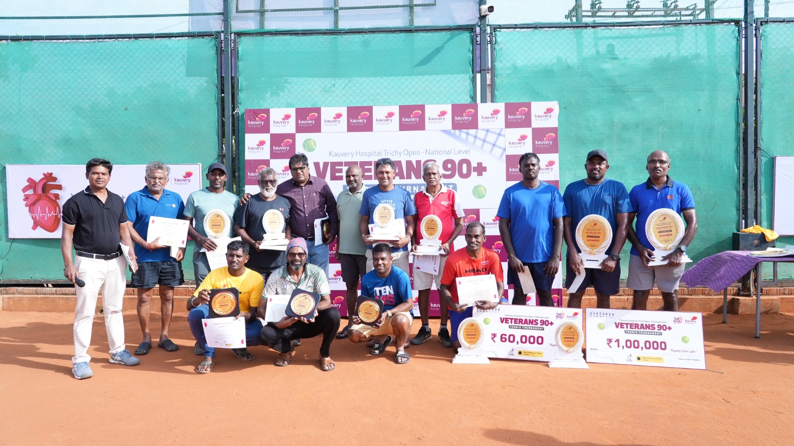 Trichy, 22nd July 2024 – The Kauvery Hospital Trichy Open National Level Veterans 90+ Doubles Tennis Championship concluded with an exciting finals held on July 21st, 2024, at the Jay’s Institute of Tennis/Challengers Tennis Academy in Trichy. This groundbreaking event, the first of its kind in India, brought together veteran tennis players from across the nation to compete and showcase their skills.