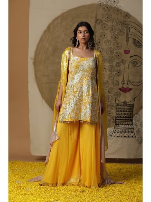 Short Kurtis with a Twist: Combine short kurtis with flared skirts or palazzos in playful colors for a mix of comfort and charm. Shop this elegant set from Arpita Sulakshana.