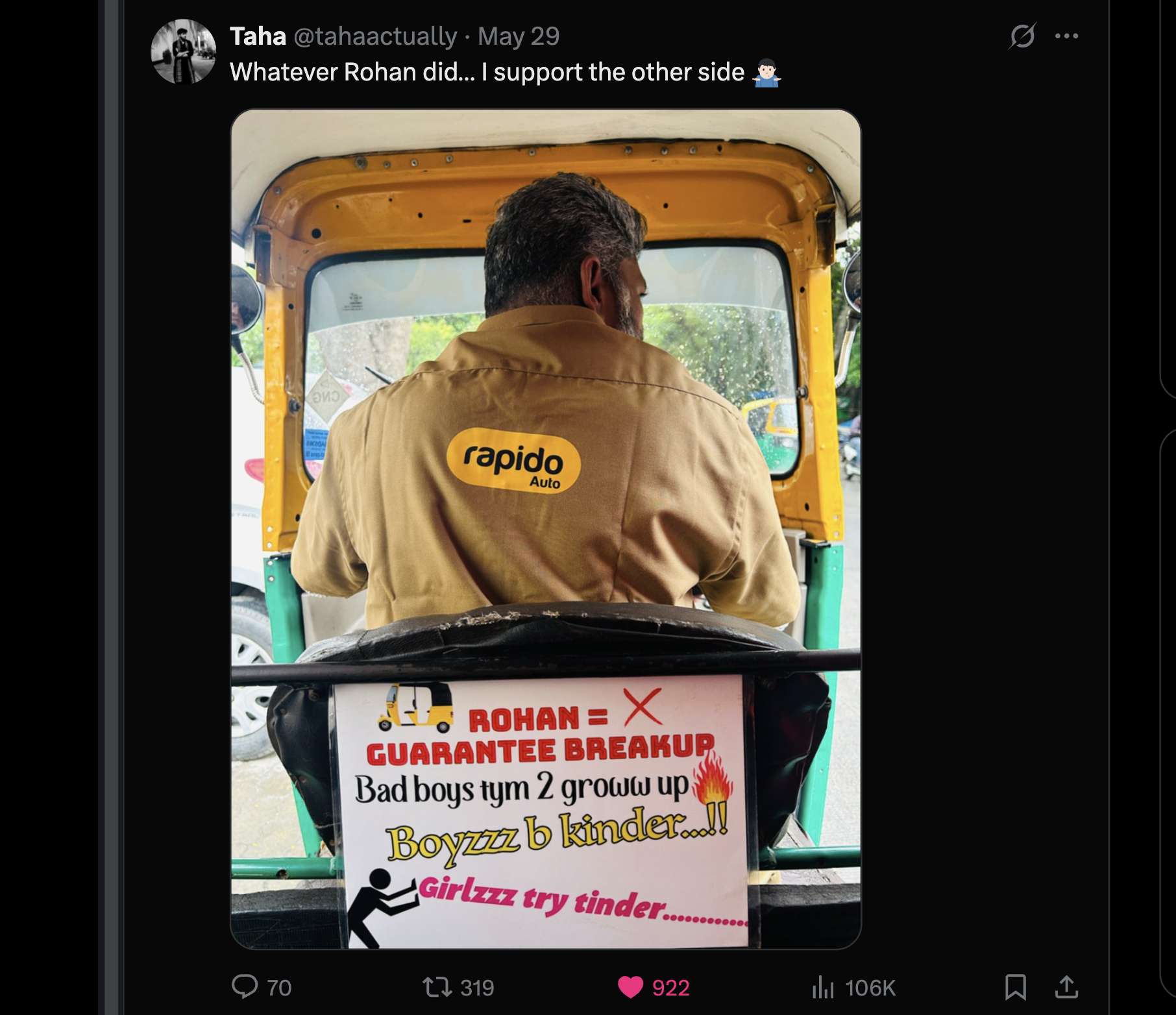 The autorickshaw driver, whose identity remains unknown, is being celebrated online as an unexpected “heartbreak awareness ambassador.” Memes, Reels, and full-blown tweet threads, with many jokingly calling for a “Rohan proximity alert” on dating apps and ride-hailing services alike.