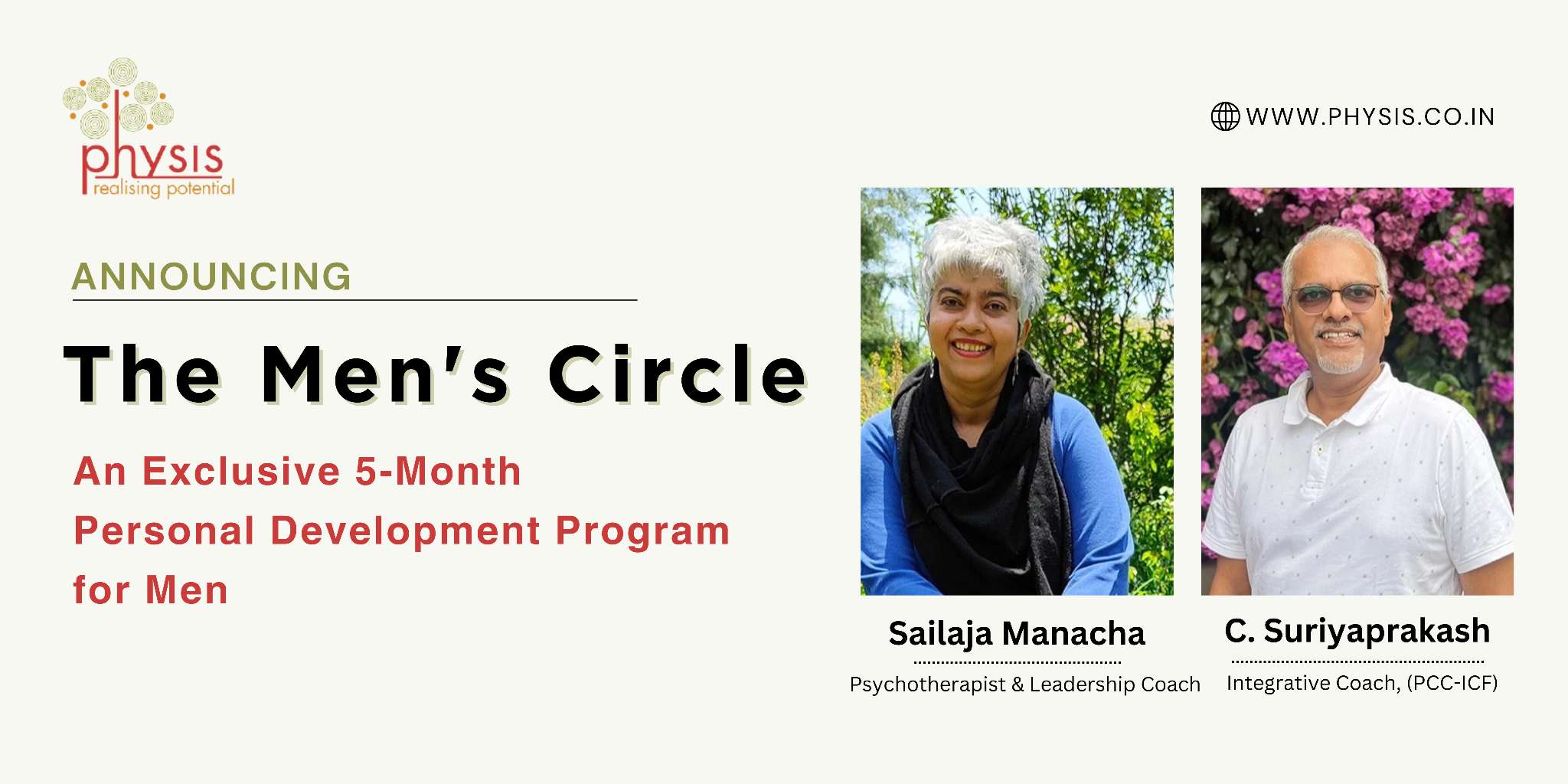 Bangalore, India – January 9, 2024 – India’s top leadership coach Sailaja Manacha and Integrative Coach C. Suriyaprakash are launching The Men’s Circle, a five-month personal development program designed to help men explore emotional well-being, leadership, empathy and balance in life and work. The program provides men over 30 with a transformative growth in a safe space to reflect, challenge, share, and develop skills that improve their relationships, work dynamics, and overall quality of life.