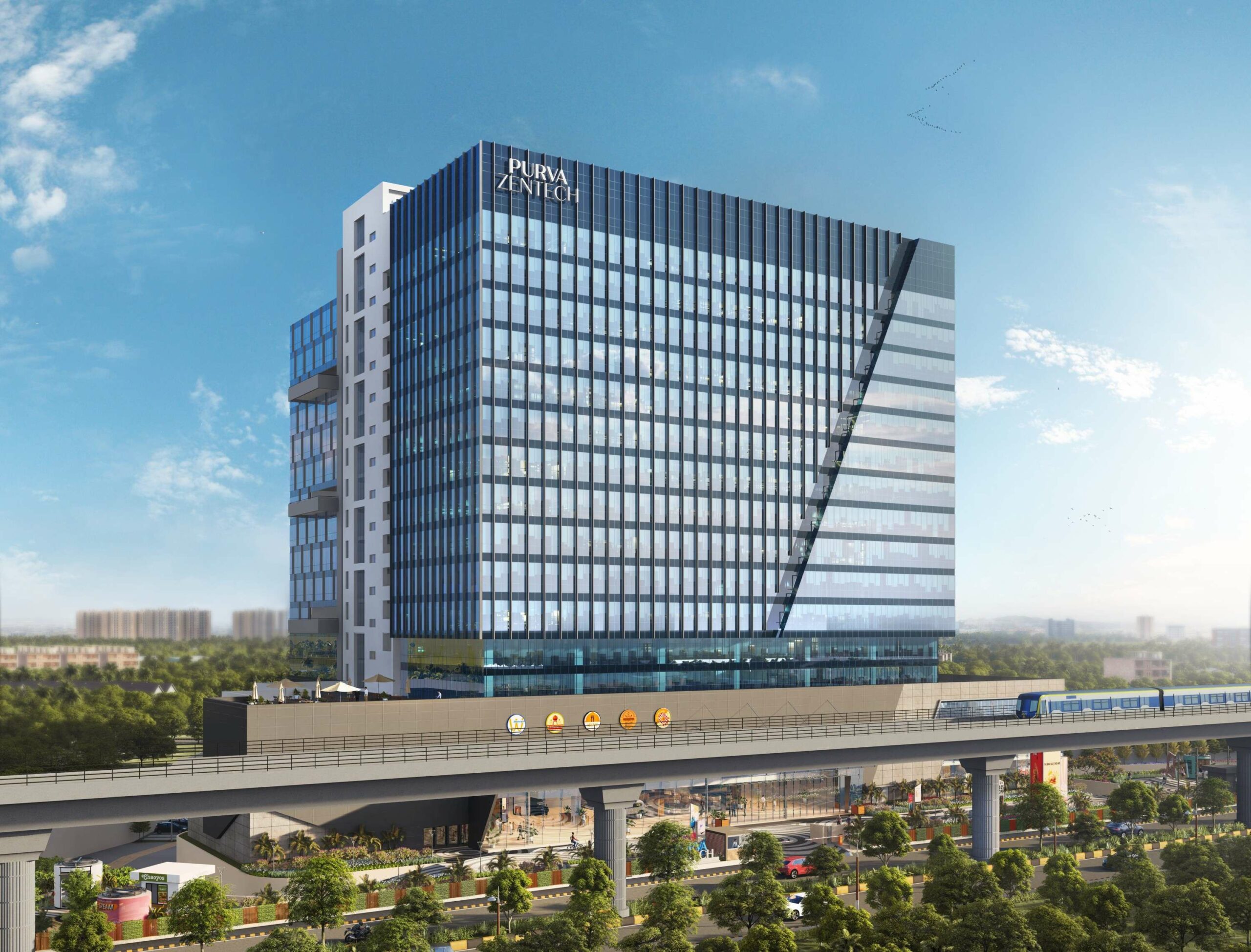 Purva Zentech Park is a mixed-use commercial development with approximately 9.6 lakh square feet of leasable and saleable area. Typical floor plates are approximately 50,000 square feet, with modular units ranging from 4,500 to 5,000 square feet available for lease or sale. Strategically located within a five-minute walk from both the Konankunte Metro Station and Forum Mall, the project is a sustainable, Indian Green Building Council (IGBC) Gold development, designed to accommodate large-format tenants as well as mid-sized occupiers. The development is currently under construction and is slated for completion by early 2026.