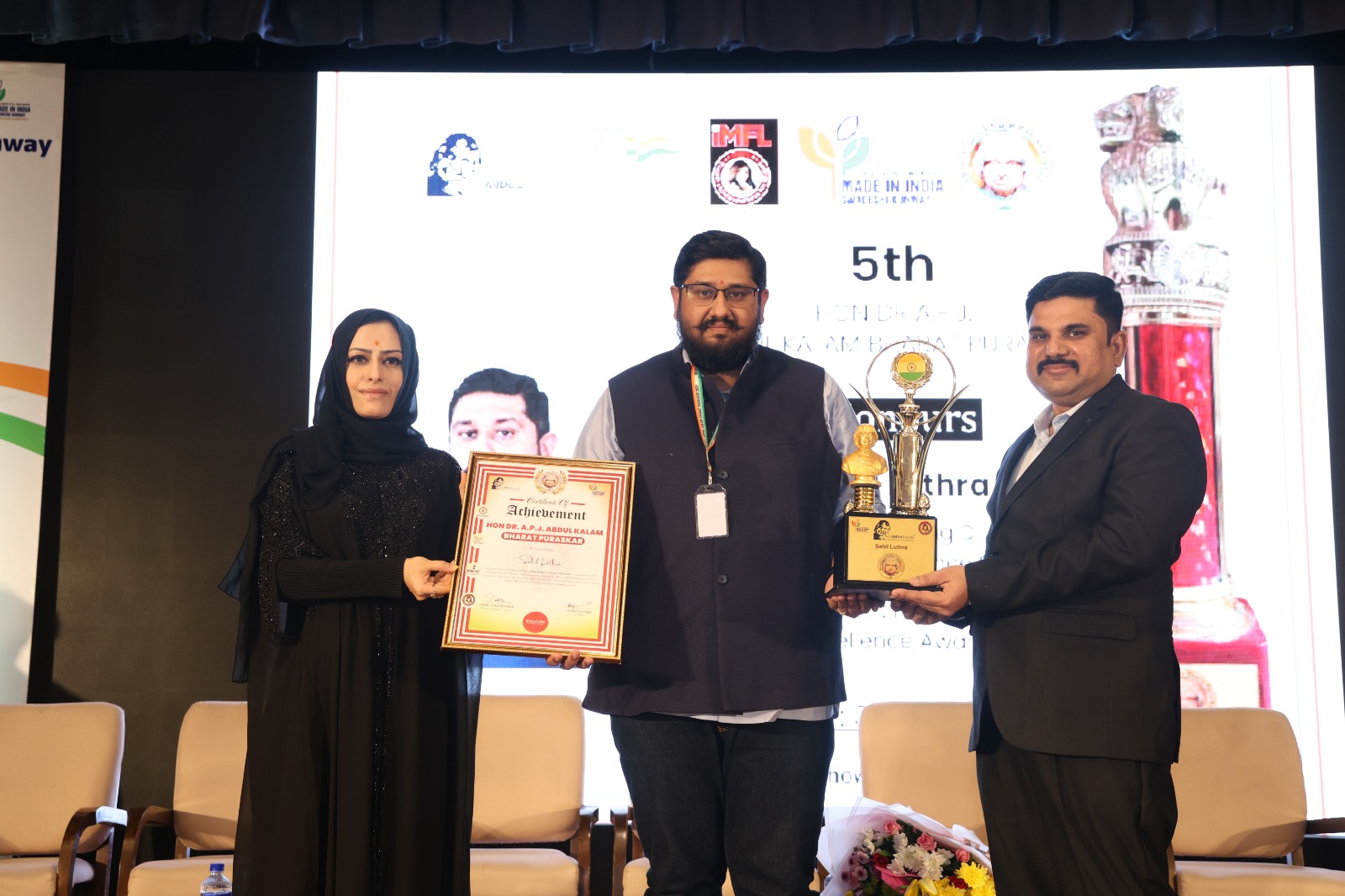 The award was presented by Hon’ble Dr. Arshi Ayub Zaveri, a globally respected figure and Powerwoman of Legacy, UAE. The honour acknowledges leaders and changemakers whose work aligns with the ideals of late Dr. A.P.J. Abdul Kalam — innovation, nation-building, and self-reliance.