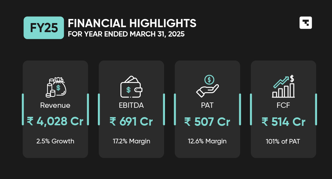• Free cash flow of ₹514 Cr, 101% of PAT