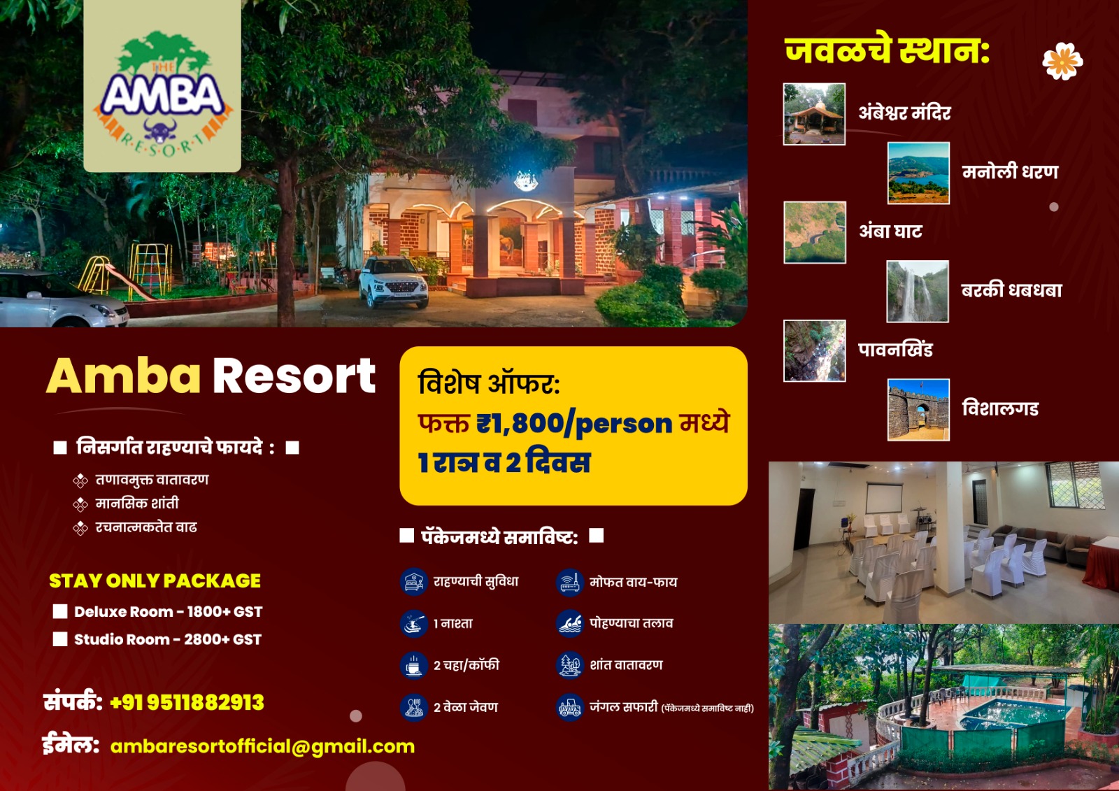 Amba Resort is a quiet place in the Forest, 60 km from Kolhapur. It’s located in Amba village, which has pleasant cool weather and scenic views.