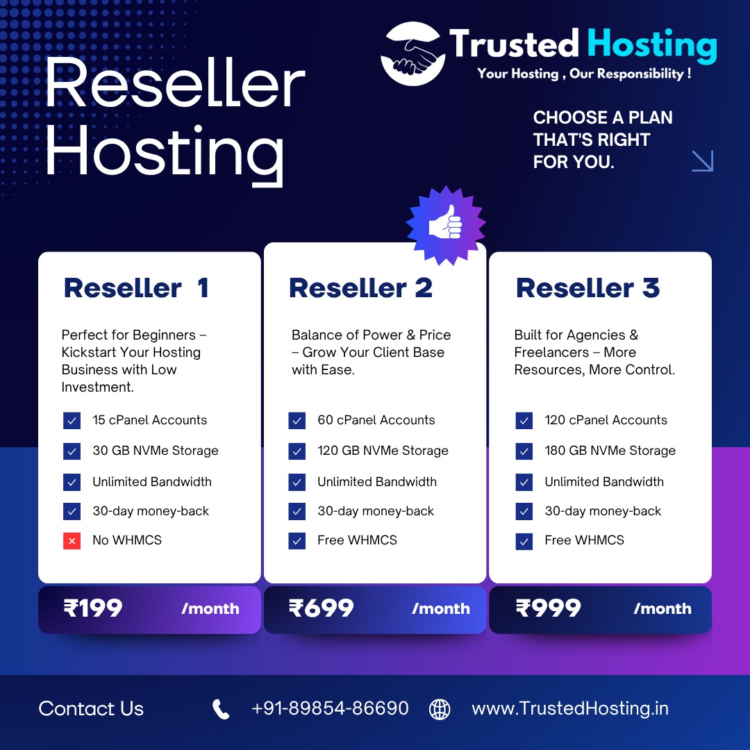 Catering to freelancers, developers, digital agencies, and IT startups, TrustedHosting.in has empowered over 10,000+ resellers across India and abroad to start their own hosting businesses — with plans starting at just ₹199/month.