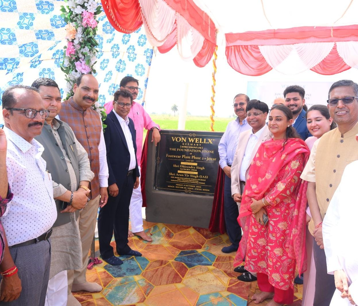 4th October,2024. Von Wellx Germany Group laid the Foundation stone of its New Footwear Plant Phase 2 at Jewar, Noida. The plant is being set up as part of the 300 crores investment on 10000 sqm with a covered area of 1,30,000 sqft in Sector 29, YEIDA, Jewar. The foundation stone was laid on Friday, 4th Oct by Shri Dhirendra Singh, Hon’ble MLA, Jewar – Chief Guest and Shri Arun Vir Singh, CEO – YEIDA and NOIDA International Airport Ltd (NIAL) – Guest of Honour in the gracious presence of Shri Kapil Singh, IAS, Additional CEO, Smt. Shruti Additional CEO, Shri Ashwaf Saifi, President, Minority Affairs Commission UP and various International and National dignitaries. All the company partners from the US, Germany, Dubai, the Middle East, Africa, Malaysia, Sri Lanka, Indonesia, China and Japan joined amongst other countries.